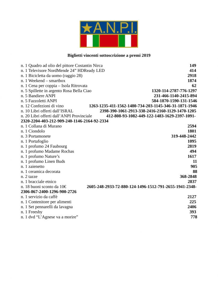 Biglietti vincenti sottoscrizione 2019