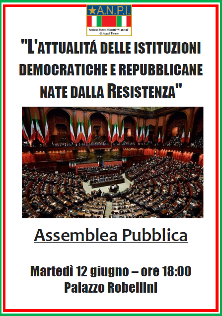 Martedì 12 giugno (ore 18, Palazzo Robellini) l’ANPI sezione Minetti-Mancini di Acqui Terme convoca un’assemblea degli iscritti aperta alla cittadinanza dal tema: “L’attualitá delle istituzioni democratiche e repubblicane nate dalla Resistenza”. La grave crisi istituzionale dei mesi scorsi, seguenti le elezioni politiche del 4 marzo e culminate con le dure prese di posizione nei confronti della Presidenza della Repubblica, non sono che l’ultimo episodio di una delegittimazione delle istituzioni e dell’impianto costituzionale che perdura da diverso tempo, con attacchi trasversali. Pertanto abbiamo pensato ad un incontro (tra iscritti e non) per approfondire questo momento storico complesso e confuso. Ad oggi, anche se un governo è stato formato, resta un pulsione politica radicale che potrebbe risultare pericolosa per l’assetto e la salute delle nostre istituzioni repubblicane, in netto contrasto con la loro origine resistenziale e la loro legittimazione attraverso la carta costituzionale. Comprendere e rispettare il senso e la conformazione del nostro Stato è, più che mai, urgente attualità e deve essere argomento di partecipazione perché diritto ma soprattutto un dovere di tutti i cittadini. Vi aspettiamo.