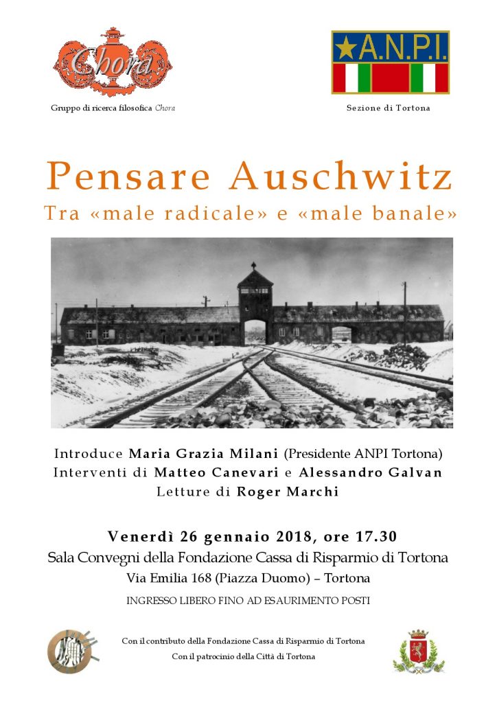 L’incontro “Pensare Auschwitz. Tra ‘male radicale’ e ‘male banale'”, che si terrà venerdì 26 gennaio alle ore 17.30 nella Sala Convegni della Fondazione Cassa di Risparmio di Tortona, è organizzato dal Gruppo di ricerca filosofica “Chora” e dall’ANPI di Tortona, con il contributo della Fondazione Cassa di Risparmio di Tortona e il patrocinio del Comune di Tortona.