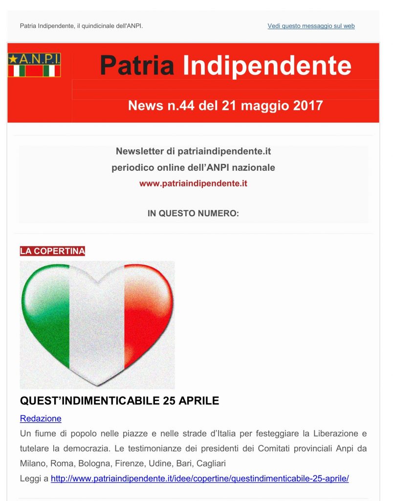 Newsletter n. 44 del 21 maggio 2018 Patria Indipendente – Essere antifascisti oggi