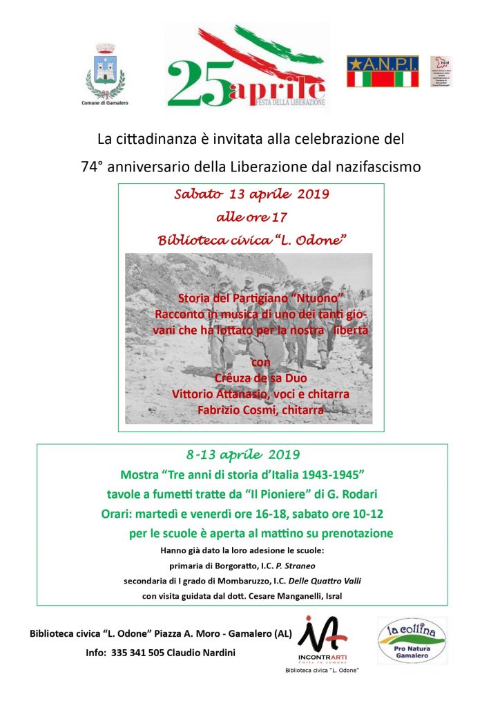 Sabato 13 aprile 2019 alle ore 17:00 alla Biblioteca civica “L. Odone” di Gamalero: Storia del Partigiano “Ntuono”  Racconto in musica di uno dei tanti giovani che ha lottato per la nostra libertà  con  Crêuza de sa Duo